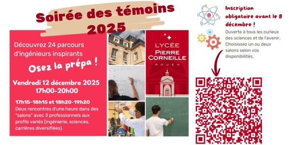 Organisé par le lycée Pierre Corneille, cet événement est spécialement conçu pour les étudiants en CPGE et les lycéens souhaitant découvrir la formation des Classes Préparatoires aux Grandes Ecoles. Au cours de cette soirée, des professionnels ayant tous suivi une classe préparatoire présenteront leur métier, partageront leur parcours et témoigneront de l’intérêt et des perspectives qu’offrent cette formation d’excellence. Les participants auront l’occasion de rencontrer deux groupes de professionnels (deux "salons") pour échanger avec eux et obtenir des réponses concrètes et des conseils avisés sur l’orientation, les débouchés et la réalité du monde professionnel après une prépa. Retrouvez plus d’informations en suivant ce lien : https://sites.google.com/view/temoins2025-lycee-corneille/accueil